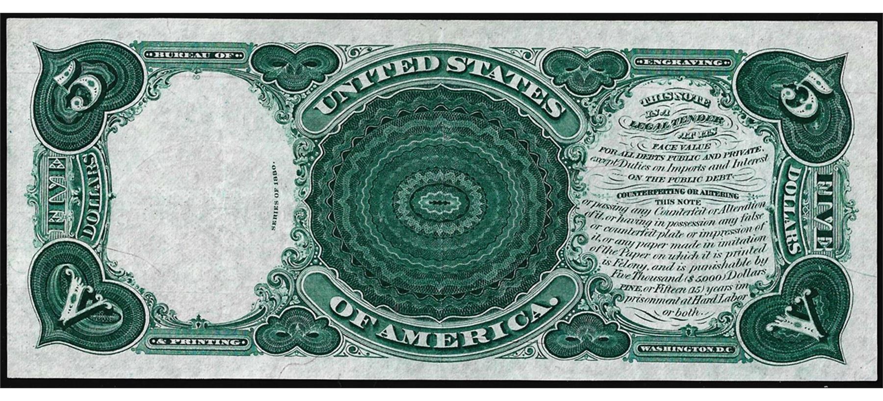 One 1880 $5 Woodchopper Legal Tender Note.