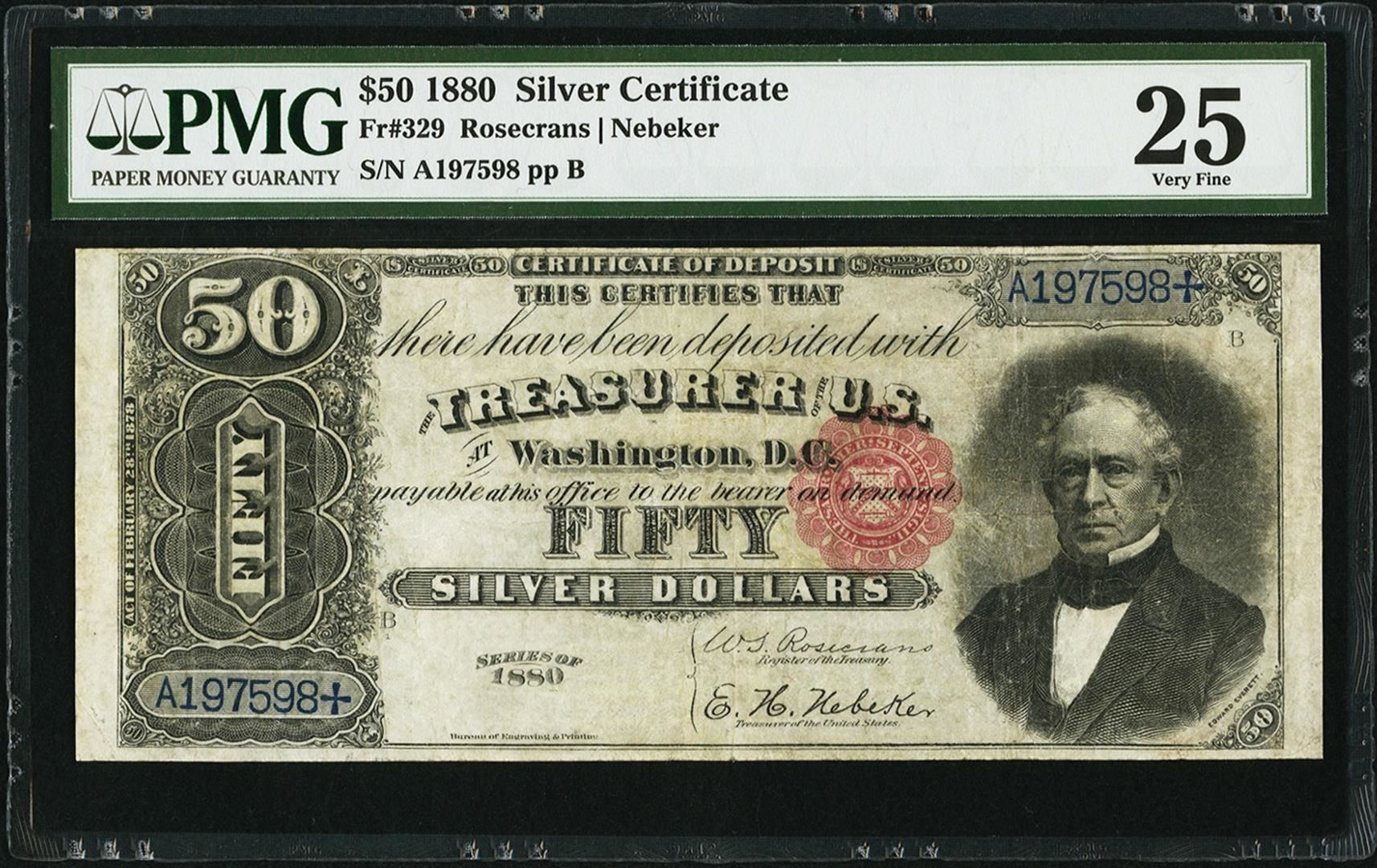One rare 1880 $50 Silver Certificate Note Fr.329 PMG Graded Very Fine 25. This is only 1 of 29 examples in the current census for this rare Friedberg number. This is the final $50 Silver Certificate to utilize the black back with the word, "Silver," in large capital letters, the most prominent feature. The face of this note is essentially identical to the nine previous varieties, save for the use of the small red scalloped seal which continues on, as the back design changes to the green back 1891 series. PMG Certified.