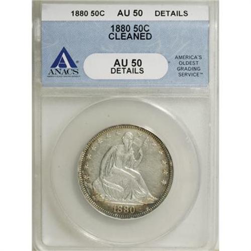 <B>1880 50C --Cleaned--ANACS. AU50 Details.</B></I> NGC Census: (0/69). PCGS Population (2/101). Mintage: 8,400. Numismedia Wsl. Price for NGC/PCGS coin in AU50: $450. (#6362)<BR><BR><B>Coin Engraver:</B> Christian Gobrecht<BR><BR><b>Shipping:</b> Coins & Currency (<a target="_blank" href="http://www.heritageauctions.com/common/shipping.php">view shipping information</a>)