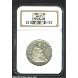 1880 50C AU53 NGC. The mildly prooflike surface has been subdued by light circulation. Nicely struck