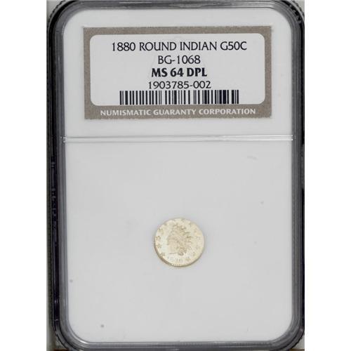 <B>1880 50C Indian Round 50 Cents, BG-1068, High R.5, MS64 Deep Mirror Prooflike NGC.</B></I> Not merely the finest certified piece in the <I>Census,</B></I> this is the only piece recorded by NGC (9/06). This well-kept beauty is worthy, with deeply reflective fields and nicely contrasting yellow-gold devices. Highly appealing.<BR><BR><b>Shipping:</b> Coin/Currency (<a target="_blank" href="http://www.heritageauctions.com/common/shipping.php">view shipping information</a>)
