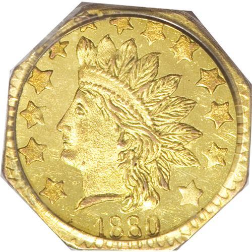 <B>1880 50C Indian Octagonal 50 Cents, BG-955, R.6, MS65 PCGS.</B></I> An early die state unlisted in the second edition of Breen-Gillio. CAL is bold instead of largely effaced. In the third edition, BG-955A will likely be created to represent the effaced CAL die state, similar to BG-958A and BG-960A. A beautiful Gem with reflective fields and frosty motifs. Population: 2 in 65, 1 finer (3/07).<BR><I>From The Diamond K Collection of California Fractional Gold.</B></I><BR><BR><b>Shipping:</b> Coins & Currency (<a target="_blank" href="http://www.heritageauctions.com/common/shipping.php">view shipping information</a>)