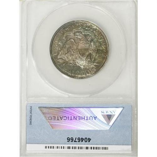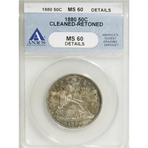 <B>1880 50C --Cleaned, Retoned--ANACS. MS60 Details.</B></I> A scant 8,400 business strikes were coined. This crisply struck survivor has satiny luster and faint marks on the lowered arm and right obverse field. The mottled sea-green, rose, and olive-gold toning is deemed suspicious by ANACS.<BR><BR><B>Coin Engraver:</B> Christian Gobrecht<BR><BR><b>Shipping:</b> Coins & Currency (<a target="_blank" href="http://www.heritageauctions.com/common/shipping.php">view shipping information</a>)