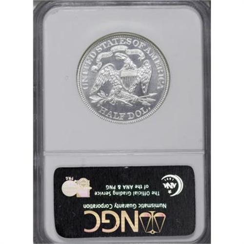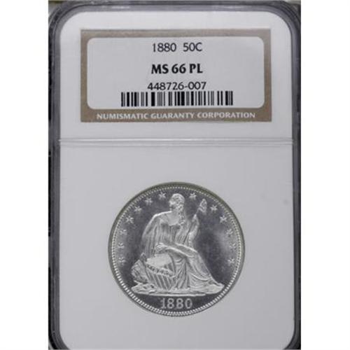 <B>1880 50C MS66 Prooflike NGC.</B></I> An intensely beautiful example with fully brilliant silver surfaces. The devices are moderately frosted with fully prooflike fields. Few marks can be found on either side of this beauty. The design elements are all boldly detailed. Census: 11 in 66, 6 finer (1/08).<BR><I>From The Southwest Collection.</B></I><BR><BR><B>Coin Engraver:</B> Christian Gobrecht<BR><BR><b>Shipping:</b> Coins & Currency (<a target="_blank" href="http://www.heritageauctions.com/common/shipping.php">view shipping information</a>)<BR><BR><B>Important notice:</B> Heritage usually auctions material at the rate of 200-250 lots per hour. On some occasions eBay Live bid software or the Internet may not be able to keep up with the pace of the auction. We recommend placing a realistic absentee bid now as insurance to avoid disappointment. Occasionally the auctioneer may eliminate or reject an eBay Live bid, and the auctioneer may also reopen a lot after the close of the eBay live bidding (usually because we missed an audience bid), and may reject your bid even if it shows you as the winning bidder. By bidding via eBay Live, you agree that Heritage may award the lot to another bidder at its sole discretion under the circumstances described above or any other reasonable circumstances. Since eBay bids are not shown to us until we open the lot on the floor, we treat those bids just like floor bids. In most cases the floor responds before the eBay bid is presented to us, due to Internet lag time, so for consistency we have made it a policy that floor bids are always considered first over tie eBay live bids. Also please note that all Heritage lots purchased through eBay Live carry a 20% Buyer's Premium with a $9 minimum Buyer's Premium. Please make sure you read the Terms and Conditions before you bid. This lot is being auctioned in conjunction with a live floor auction by Heritage Auctions. All final auction and invoice information will be supplied by Heritage Auctions, and all other information should be considered preliminary. Lot:629<BR><BR><B>Winning Notification and Billing:</B> After the FINAL session in this auction is complete, Heritage will send e-mail and snail mail invoices. This process normally takes several days. All final auction and invoice information will be supplied by Heritage Auctions, and all other information should be considered preliminary. <BR><BR><B>Second Chance Offers:</B> Heritage does not make Second Chance Offers. Once our auction ends, if you receive a Second Chance Offer to buy this item DO NOT accept the offer. Please forward any Second Chance offer emails received on one of our auctions to eBay's Safe Harbor Department. <BR><BR>This auction will be conducted on a live auction floor and over the Internet through eBay Live. If you choose to place an absentee bid, please take a moment to <font color='#0000ff'><u><a href='http://pages.ebay.com/liveauctions/help/before/laabsentee.html'>learn how eBay Live absentee bidding works</a></u></font><font color='#000000'>