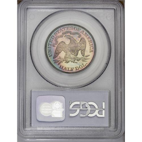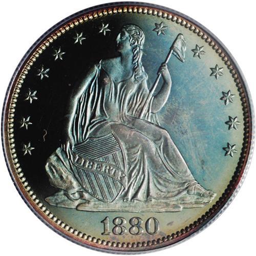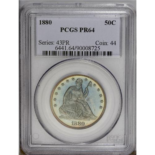 <B>1880<50C> PR64 PCGS.</B></I> Beautiful aquamarine and golden color overlays the obverse with electric-blue, crimson-magenta, and golden toning over the reverse. The boldly struck details of this pleasing near-Gem contrast nicely to the deeply mirrored fields. There are a few small marks in the right obverse field that must be considered regarding the assigned grade of this piece. <BR><BR><B>Important notice:</B> Heritage usually auctions material at the rate of 200-250 lots per hour. On some occasions eBay Live bid software or the Internet may not be able to keep up with the pace of the auction. We recommend placing a realistic absentee bid now as insurance to avoid disappointment. Occasionally the auctioneer may eliminate or reject an eBay Live bid, and the auctioneer may also reopen a lot after the close of the eBay live bidding (usually because we missed an audience bid), and may reject your bid even if it shows you as the winning bidder. By bidding via eBay Live, you agree that Heritage may award the lot to another bidder at its sole discretion under the circumstances described above or any other reasonable circumstances. Since eBay bids are not shown to us until we open the lot on the floor, we treat those bids just like floor bids. In most cases the floor responds before the eBay bid is presented to us, due to Internet lag time, so for consistency we have made it a policy that floor bids are always considered first over tie eBay live bids. Also please note that all Heritage lots purchased through eBay Live carry a 20% Buyer's Premium. Please make sure you read the Terms and Conditions before you bid. This lot is being auctioned in conjunction with a live floor auction by Heritage Galleries & Auctioneers. All final auction and invoice information will be supplied by Heritage Galleries & Auctioneers, and all other information should be considered preliminary. Lot:2033 <BR><BR><B>Winning Notification and Billing:</B> After the FINAL session in this auction is complete, Heritage will send e-mail and snail mail invoices. This process normally takes several days. All final auction and invoice information will be supplied by Heritage Galleries & Auctioneers, and all other information should be considered preliminary. <BR><BR>This auction will be conducted on a live auction floor and over the Internet through eBay Live. If you choose to place an absentee bid, please take a moment to <font color='#0000ff'><u><a href='http://pages.ebay.com/liveauctions/help/before/laabsentee.html'>learn how eBay Live absentee bidding works</a></u></font><font color='#000000'>