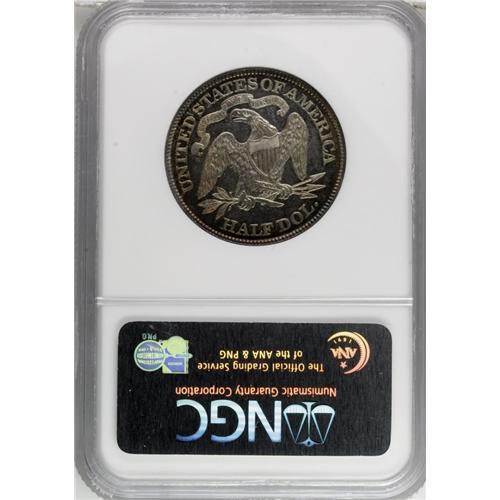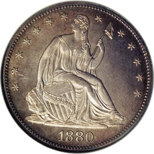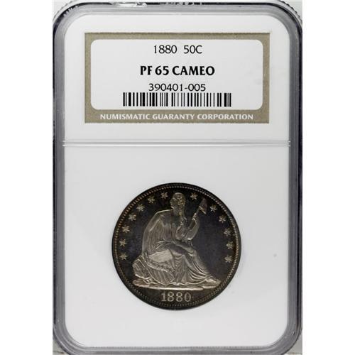 <B>1880 50C PR65 Cameo NGC.</B></I> Type Two Reverse. Stunning cameo contrast appears at all angles beneath a soft layer of light gold-tan patina that is accented with dappled cobalt-blue and lavender around the borders. One of this specimen's best features is razor-sharp definition on all of the design elements. A few wispy handling marks preclude a higher grade. Census: 11 in 65 Cameo, 12 finer (12/06).<BR><BR><b>Shipping:</b> Coin/Currency (<a target="_blank" href="http://www.heritageauctions.com/common/shipping.php">view shipping information</a>)