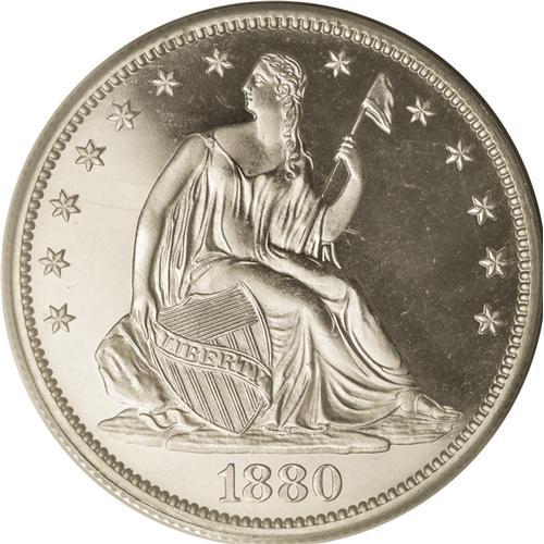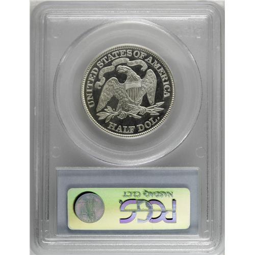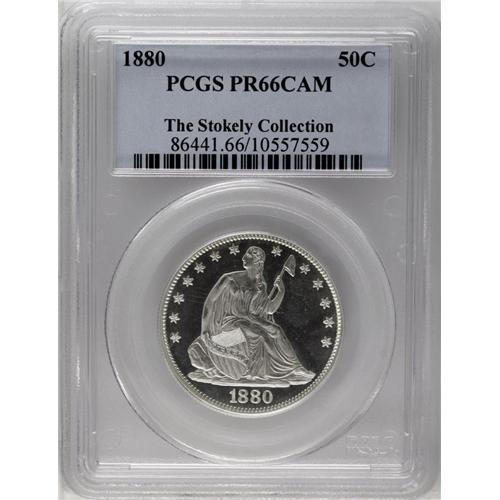 <B>1880<50C> PR66 Cameo PCGS.</B></I> Type Two Reverse. Obvious, undeniable cameo contrast is provided by the ice-white devices and the darkly mirrored fields. The strike is good, but a pair of thin roller marks are retained from the planchet prior to the strike, one on the left (facing) thigh, and the other above the right scroll end. Flawless from the technical perspective. Population: 6 in 66 Cameo, 0 finer (6/06).<BR><I>From The Stephen Stokely #1 PCGS Registry Set of Proof Seated Half Dollars.</B></I>