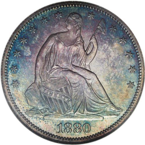 <B>1880 50C PR66 NGC.</B></I> Type Two Reverse. Jade-green, rose, and steel-blue toning predominate on each side. This boldly struck Premium Gem proof reveals only a few trivial hairlines in the fields, but the overall eye appeal is extremely high for this low mintage issue of both proofs and business strikes. Census: 21 in 66, 9 finer (12/06).<BR><BR><b>Shipping:</b> Coin/Currency (<a target="_blank" href="http://www.heritageauctions.com/common/shipping.php">view shipping information</a>)