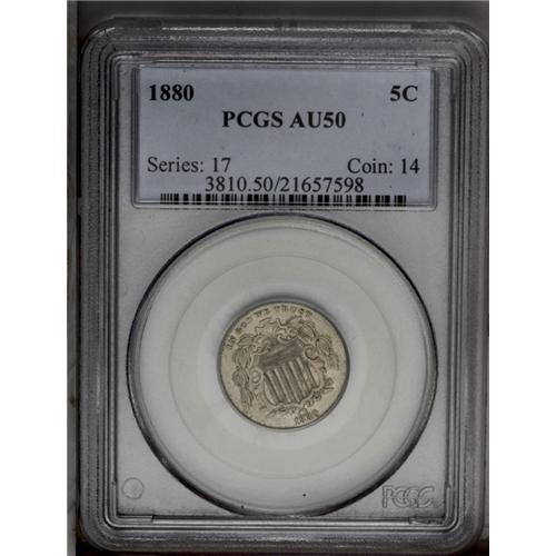 <B>1880<5C> AU50 PCGS.</B></I> This is an extremely rare business strike without even a trace of proof surface. Attractive light gray surfaces with minor abrasions. Most of the design features are sharply struck. We expect that this important nickel will sell for much more than the current price guides suggest. <BR><BR><B>Important notice:</B> Heritage usually auctions material at the rate of 200-250 lots per hour. On some occasions eBay Live bid software or the Internet may not be able to keep up with the pace of the auction. We recommend placing a realistic absentee bid now as insurance to avoid disappointment. Occasionally the auctioneer may eliminate or reject an eBay Live bid, and the auctioneer may also reopen a lot after the close of the eBay live bidding (usually because we missed an audience bid), and may reject your bid even if it shows you as the winning bidder. By bidding via eBay Live, you agree that Heritage may award the lot to another bidder at its sole discretion under the circumstances described above or any other reasonable circumstances. Since eBay bids are not shown to us until we open the lot on the floor, we treat those bids just like floor bids. In most cases the floor responds before the eBay bid is presented to us, due to Internet lag time, so for consistency we have made it a policy that floor bids are always considered first over tie eBay live bids. Also please note that all Heritage lots purchased through eBay Live carry a 20% Buyer's Premium. Please make sure you read the Terms and Conditions before you bid. This lot is being auctioned in conjunction with a live floor auction by Heritage Galleries & Auctioneers. All final auction and invoice information will be supplied by Heritage Galleries & Auctioneers, and all other information should be considered preliminary. Lot:863 <BR><BR><B>Winning Notification and Billing:</B> After the FINAL session in this auction is complete, Heritage will send e-mail and snail mail invoices. This process normally takes several days. All final auction and invoice information will be supplied by Heritage Galleries & Auctioneers, and all other information should be considered preliminary. <BR><BR>This auction will be conducted on a live auction floor and over the Internet through eBay Live. If you choose to place an absentee bid, please take a moment to <font color='#0000ff'><u><a href='http://pages.ebay.com/liveauctions/help/before/laabsentee.html'>learn how eBay Live absentee bidding works</a></u></font><font color='#000000'>
