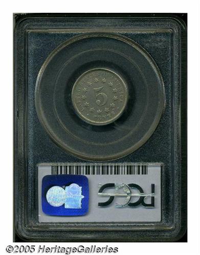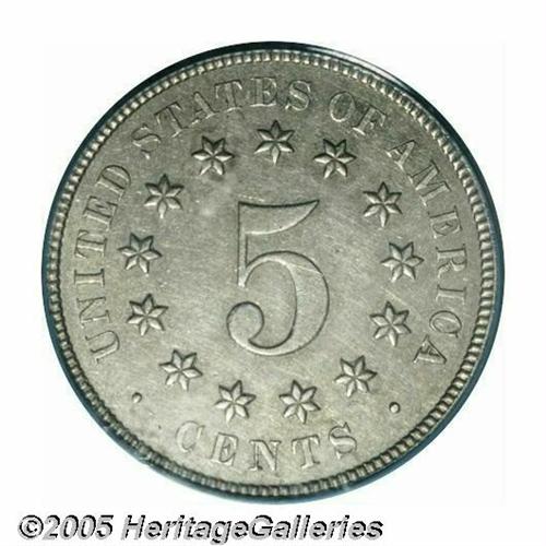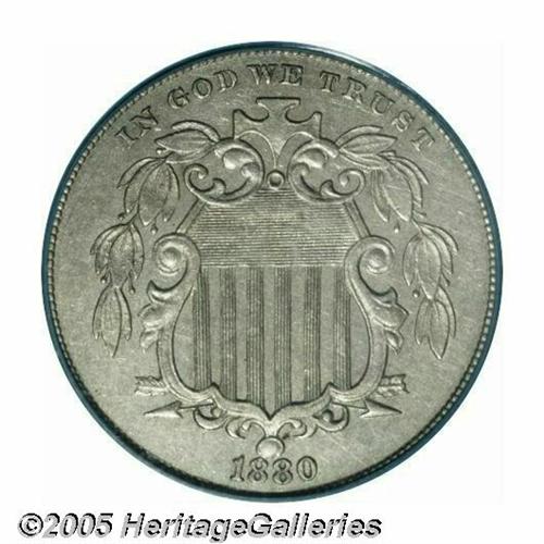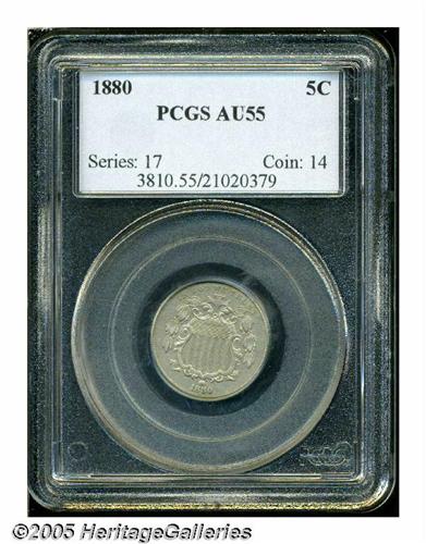 <B>1880<5C> AU55 PCGS.</B></I> Nicely defined with light gray patina. The lowest mintage (16,000) business strike issue of the Shield nickel series. The importance of this issue in business strike format will not be lost among the specialists of this series. Our auction archives provide details of all coins sold by us over the last 12 years. The data indicates that we have offered 219 examples of this date, including 202 Proof examples and just 17 business strikes! Population: 8 in 55, 18 finer (5/05).<BR><I>From The Western Hills Collection.</B></I>