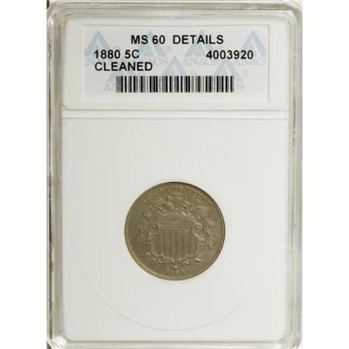 <B>1880 5C --Cleaned--ANACS. MS60 Details.</B></I> This later Shield nickel is solidly struck with no trace of wear. The green-gold rims surround lackluster, significantly hairlined nickel-gray surfaces that account for the net grade.<BR><I>From The Diemer L. Fife Collection.</B></I><BR><BR><B>Coin Engraver:</B> James B. Longacre<BR><BR><b>Shipping:</b> Coins & Currency (<a target="_blank" href="http://www.heritageauctions.com/common/shipping.php">view shipping information</a>)