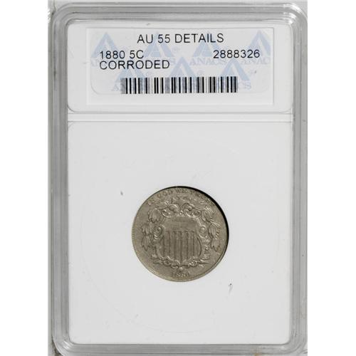 <B>1880<5C>--Corroded--ANACS. AU55 Details.</B></I> The 1880 is the key business strike issue of the series. This slate-gray example shows only a trace of wear, but the luster is subdued and the surfaces are faintly granular.