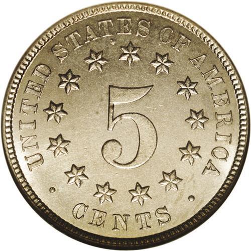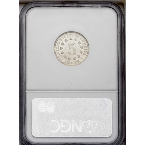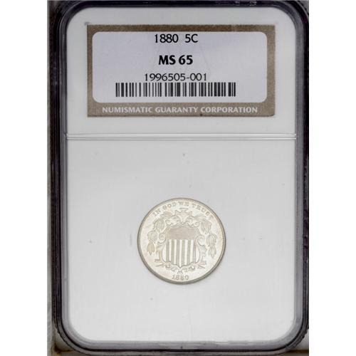 <B>1880<5C> MS65 NGC.</B></I> Breen-2516. This is the "Dropped 8" variety that Walter Breen mistakenly called a proof-only variety. There is no question that business strikes exist for this variety, including the present coin. The 1880 Shield nickel is a major rarity in business strike format, yet it is quite common in proof format.<BR> Several important die markers are visible. In addition to the doubling inside the second 8, there is a raised die lump on the top surface of the upper left curve of S in TRUST. Some proof examples have a small "star-point" projection from the obverse border at 7 o'clock, but that projection is entirely absent on this coin. The reverse of this business strike example has a raised die defect or lump located just below the bottom right serif of the second T in STATES. Several diagonal die lines are visible, including one through the right side of N in UNITED, to the left side of the large 5.<BR> This example is a wonderful Gem quality example with extremely sharp obverse and reverse design details. There are no surface imperfections of any significance. Both sides have satiny luster beneath pale champagne toning with tiny golden freckles. There is no doubt that a business strike 1880 Shield nickel is the single rarest issue of the design, the true key to a complete set of these coins. It has only recently received its due, and eventually, market levels should reflect its true rarity. Census: 2 in 65, 0 finer (4/06).