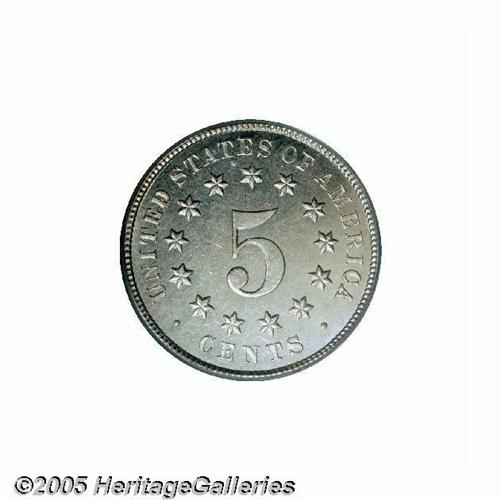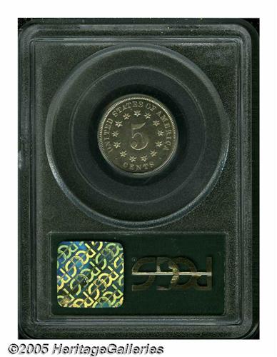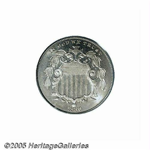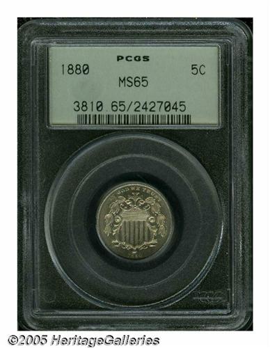<B>1880<5C> MS65 PCGS.</B></I> Here is a very rare issue in any Mint State grade, and a coin which is virtually impossible to locate in Gem Uncirculated grades as offered here. Note the vibrant mint luster in the fields, and the satiny surfaces. We note a minute faded speck below the N of IN on the obverse, and the coin is bright save for a minor blush of color surrounding the date. A scant 16,000 were coined as virtually all the coining efforts went into the massive Morgan silver dollar production starting in 1878. There are no flyspecks or similar detractions on this memorable coin, and any collector would appreciate this quality. The combined NGC and PCGS Population reports note 5 pieces have been graded this high, with a single coin graded higher. Keep this in mind when bidding, as a finer example is unlikely to appear anytime soon. Housed in an older green label PCGS holder.