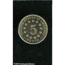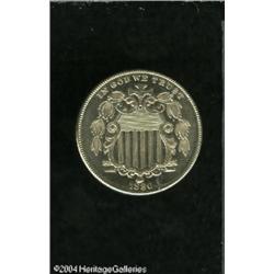 1880 5C PR63 Uncertified. Faint speckled milky-gol <B>1880 5C PR63 Uncertified.</B></I> Faint speckled milky-gold color over bright surfaces. The design elements are exquisitely struck, and the surfaces are virtually devoid of mentionable marks. A very handsome proof Shield nickel. <BR><BR><B>Important notice:</B> Heritage usually auctions material at the rate of 200-250 lots per hour. On some occasions eBay Live bid software or the Internet may not be able to keep up with the pace of the auction. We recommend placing a realistic absentee bid now as insurance to avoid disappointment. Occasionally the auctioneer may eliminate or reject an eBay Live bid, and the auctioneer may also reopen a lot after the close of the eBay live bidding (usually because we missed an audience bid), and may reject your bid even if it shows you as the winning bidder. By bidding via eBay Live, you agree that Heritage may award the lot to another bidder at its sole discretion under the circumstances described above or any other reasonable circumstances. Since eBay bids are not shown to us until we open the lot on the floor, we treat those bids just like floor bids. In most cases the floor responds before the eBay bid is presented to us, due to Internet lag time, so for consistency we have made it a policy that floor bids are always considered first over tie eBay live bids. Also please note that all Heritage lots purchased through eBay Live carry a 20% Buyer's Premium. Please make sure you read the Terms and Conditions before you bid. This lot is being auctioned in conjunction with a live floor auction by Heritage Galleries & Auctioneers. All final auction and invoice information will be supplied by Heritage Galleries & Auctioneers, and all other information should be considered preliminary. Lot:5512