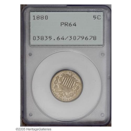 1880 5C PR64 PCGS. Moderately refelctive with a pale o 1880[5C] PR64 PCGS.