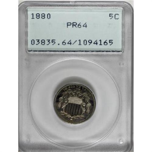 <B>1880 5C PR64 PCGS.</B></I> PCGS Population (307/429). NGC Census: (147/398). Mintage: 3,955. Numismedia Wsl. Price for NGC/PCGS coin in PR64: $340. (#3835)<BR><BR><B>Coin Engraver:</B> James B. Longacre<BR><BR><b>Shipping:</b> Coins & Currency (<a target="_blank" href="http://www.heritageauctions.com/common/shipping.php">view shipping information</a>)