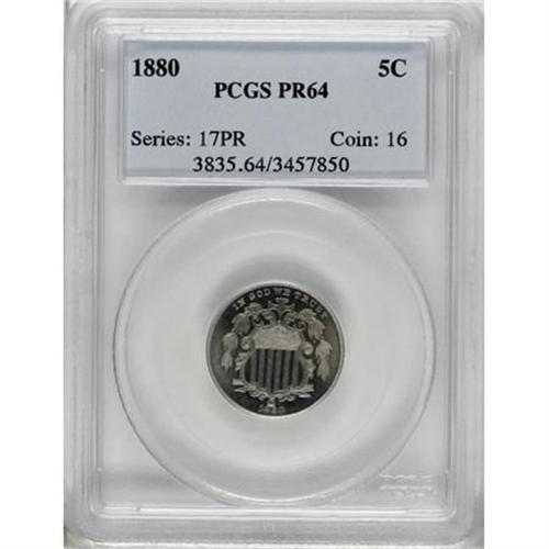 <B>1880 5C PR64 PCGS.</B></I> PCGS Population (312/428). NGC Census: (151/401). Mintage: 3,955. Numismedia Wsl. Price for NGC/PCGS coin in PR64: $380. (#3835)<BR><BR><B>Coin Engraver:</B> James B. Longacre<BR><BR><b>Shipping:</b> Coins & Currency (<a target="_blank" href="http://www.heritageauctions.com/common/shipping.php">view shipping information</a>)