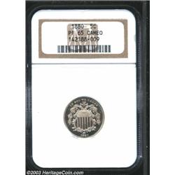 <TABLE cellSpacing=0 cellPadding=0 width="100%" bgColor=#000000 border=0><TBODY><TR><TD width="100%"><TABLE cellSpacing=1 cellPadding=3 width="100%" border=0><TBODY><TR><TD width="100%" bgColor=#79735c><FONT face=arial color=#ffffff size=3><B>Description</B> </FONT></TD></TR><TR><TD width="100%" bgColor=#ffffff><FONT face=arial size=2><B>1880 5C PR65 Cameo NGC.</B></I> A sharply struck and essentially brilliant Gem that is lovingly preserved but has a few miniscule mint-made planchet flaws. The second 8 in the date is lightly recut. Population: 15 in 65 as Cameo, 19 finer (7/03). </FONT></TD></TR></TBODY></TABLE></TD></TR></TBODY></TABLE><BR><A name=PricesRealized></A><TABLE cellSpacing=0 cellPadding=0 width="100%" bgColor=#000000 border=0><TBODY><TR><TD width="100%"><TABLE cellSpacing=1 cellPadding=3 width="100%" border=0><TBODY><TR><TD width="100%" bgColor=#79735c><A name=PR><FONT face=arial color=#ffffff size=3><B>Previous Prices from Heritage Auctions</B> </FONT></A></TD></TR><TR><TD bgColor=#f6f6ed><TABLE cellSpacing=0 cellPadding=0 width="100%" border=1><TBODY><TR><TD align=middle width="33%"><B>Date</B></TD><TD align=middle width="33%"><B>Service</B></TD><TD align=middle width="33%"><B>Price</B></TD></TR><TR bgColor=whitesmoke><TD width="33%"><B>07/29/2003</B></TD><TD width="33%">PCGS</TD><TD width="33%">$529.00</TD></TR><TR bgColor=whitesmoke><TD width="33%"><B>02/04/2003</B></TD><TD width="33%">PCGS</TD><TD width="33%">$632.50</TD></TR><TR bgColor=whitesmoke><TD width="33%"><B>08/06/2003</B></TD><TD width="33%">PCGS</TD><TD width="33%">$529.00</TD></TR><TR bgColor=whitesmoke><TD width="33%"><B>08/27/2002</B></TD><TD width="33%">PCGS</TD><TD width="33%">$603.75</TD></TR><TR bgColor=whitesmoke><TD width="33%"><B>08/13/2002</B></TD><TD width="33%">PCGS</TD><TD width="33%">$563.50</TD></TR><TR bgColor=whitesmoke><TD width="33%"><B>07/16/2002</B></TD><TD width="33%">NGC</TD><TD width="33%">$661.25</TD></TR><TR bgColor=whitesmoke><TD width="33%"><B>04/30/2002</B></TD><TD width="33%">NGC</TD><TD width="33%">$529.00</TD></TR><TR bgColor=whitesmoke><TD width="33%"><B>08/08/2001</B></TD><TD width="33%">NGC</TD><TD width="33%">$690.00</TD></TR><TR bgColor=whitesmoke><TD width="33%"><B>05/31/2001</B></TD><TD width="33%">NGC</TD><TD width="33%">$546.25</TD></TR></TBODY></TABLE></TD></TR><TR><TD bgColor=#ffffff><FONT face=arial size=1 ?>PLEASE NOTE: All prices realized reflect the final hammer price PLUS the buyer's premium in auctions that charge a buyer's premium. Each item has a notation at the top of the listing indicating whether that lot included a buyer's premium. Example: A item that sells with a final hammer price of $100 and a 20% buyer's premium will display with a price realized of $120. All information listed is intended to be as accurate as possible, but errors are possible. Please use this guide carefully and inform us of any inaccuracies. </FONT></TD></TR></TBODY></TABLE></TD></TR></TBODY></TABLE><BR><TABLE cellSpacing=0 cellPadding=0 width="100%" bgColor=#000000 border=0><TBODY><TR><TD width="100%"><TABLE cellSpacing=1 cellPadding=3 width="100%" border=0><TBODY><TR><TD width="100%" bgColor=#79735c colSpan=6><FONT face=arial color=#ffffff size=3><B>Price Guide*</B> </FONT></TD></TR><TR bgColor=#f6f6ed><TD align=middle><B>Grade</B> </TD><TD align=middle><B>Coin World<BR>(Trends)</B> </TD><TD align=middle><B>Numismedia<BR>Retail</B> </TD><TD align=middle><B>Numismedia<BR>Wholesale</B> </TD><TD align=middle><B>Coin<BR>Universe</B> </TD><TD align=middle><B>Heritage<BR>Value Index</B> </TD></TR><TR bgColor=#ffffff><TD align=middle>64</TD><TD align=right>---</TD><TD align=right>---</TD><TD align=right>---</TD><TD align=right>---</TD><TD align=right>$542.27</TD></TR><TR style="FONT-WEIGHT: bold" bgColor=#cccfdd><TD align=middle>65</TD><TD align=right>---</TD><TD align=right>---</TD><TD align=right>---</TD><TD align=right>---</TD><TD align=right>$600.09</TD></TR><TR bgColor=#ffffff><TD align=middle>66</TD><TD align=right>---</TD><TD align=right>---</TD><TD align=right>---</TD><TD align=right>$1,200.00</TD><TD align=right>$779.38</TD></TR><TR bgColor=#ffffff><TD colSpan=6><FONT size=1>*All information listed is intended to be as accurate as possible, but errors are possible. No item may be returned or refused based on this information which is provided as a service to our customers. You should contact each pricing source directly to determine the accuracy of this information. </FONT></TD></TR></TBODY></TABLE></TD></TR></TBODY></TABLE><BR><TABLE cellSpacing=0 cellPadding=0 width="100%" bgColor=#000000 border=0><TBODY><TR><TD width="100%"><TABLE cellSpacing=1 cellPadding=3 width="100%" border=0><TBODY><TR><TD width="100%" bgColor=#79735c><FONT face=arial color=#ffffff size=3><B>Population Guide</B> </FONT></TD></TR><TR bgColor=#ffffff><TD align=middle><!-- Begin Output of Population Grid--><TABLE cellSpacing=0 cellPadding=0 width="100%" border=0><TBODY><TR><TD vAlign=center><TABLE cellSpacing=0 width="100%" border=1 cellsadding="3"><TBODY><TR><TD vAlign=center><TABLE cellSpacing=0 cellPadding=3 width="100%" border=1><TBODY><TR><TD vAlign=center align=middle bgColor=#f0f1e8 colSpan=2 <CENTER><FONT face=Arial size=2><B>PCGS Pop </B></FONT><CENTER></CENTER></TD><TD vAlign=center align=middle bgColor=#f0f1e8 colSpan=2><CENTER><FONT face=Arial size=2><B>NGC Pop</B></CENTER></FONT></TD></TR><TR><TD vAlign=center><FONT face=Arial size=2>(65)</FONT> </TD><TD vAlign=center align=right><FONT face=Arial size=2>12</FONT> </TD><TD vAlign=center><FONT face=Arial size=2>(65)</FONT> </TD><TD vAlign=center align=right><FONT face=Arial size=2>15</FONT> </TD></TR><TR><TD vAlign=center><FONT face=Arial size=2>(>65)</FONT> </TD><TD vAlign=center align=right><FONT face=Arial size=2>23</FONT> </TD><TD vAlign=center><FONT face=Arial size=2>(>65)</FONT> </TD><TD vAlign=center align=right><FONT face=Arial size=2>19</FONT> </TD></TR></TBODY></TABLE></TD></TR></TBODY></TABLE></TD></TR></TBODY></TABLE><!-- End Outpu