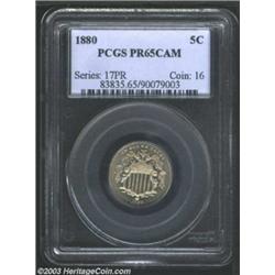 <TABLE cellSpacing=0 cellPadding=0 width="100%" bgColor=#000000 border=0><TBODY><TR><TD width="100%"><TABLE cellSpacing=1 cellPadding=3 width="100%" border=0><TBODY><TR><TD width="100%" bgColor=#79735c><FONT face=arial color=#ffffff size=3><B>Description</B> </FONT></TD></TR><TR><TD width="100%" bgColor=#ffffff><FONT face=arial size=2><B>1880 5C PR65 Cameo PCGS.</B></I> Lovely gold and olive surfaces are displayed by this Gem proof. The striking details are razor-sharp. A single noticeable contact mark rests upon each side, and a small die chip (as struck) is seen on the lower left obverse rim. Population: 12 in 65, 23 finer (8/03). </FONT></TD></TR></TBODY></TABLE></TD></TR></TBODY></TABLE><BR><A name=PricesRealized></A><TABLE cellSpacing=0 cellPadding=0 width="100%" bgColor=#000000 border=0><TBODY><TR><TD width="100%"><TABLE cellSpacing=1 cellPadding=3 width="100%" border=0><TBODY><TR><TD width="100%" bgColor=#79735c><A name=PR><FONT face=arial color=#ffffff size=3><B>Previous Prices from Heritage Auctions</B> </FONT></A></TD></TR><TR><TD bgColor=#f6f6ed><TABLE cellSpacing=0 cellPadding=0 width="100%" border=1><TBODY><TR><TD align=middle width="33%"><B>Date</B></TD><TD align=middle width="33%"><B>Service</B></TD><TD align=middle width="33%"><B>Price</B></TD></TR><TR bgColor=whitesmoke><TD width="33%"><B>07/29/2003</B></TD><TD width="33%">PCGS</TD><TD width="33%">$529.00</TD></TR><TR bgColor=whitesmoke><TD width="33%"><B>02/04/2003</B></TD><TD width="33%">PCGS</TD><TD width="33%">$632.50</TD></TR><TR bgColor=whitesmoke><TD width="33%"><B>08/06/2003</B></TD><TD width="33%">PCGS</TD><TD width="33%">$529.00</TD></TR><TR bgColor=whitesmoke><TD width="33%"><B>08/27/2002</B></TD><TD width="33%">PCGS</TD><TD width="33%">$603.75</TD></TR><TR bgColor=whitesmoke><TD width="33%"><B>08/13/2002</B></TD><TD width="33%">PCGS</TD><TD width="33%">$563.50</TD></TR><TR bgColor=whitesmoke><TD width="33%"><B>07/16/2002</B></TD><TD width="33%">NGC</TD><TD width="33%">$661.25</TD></TR><TR bgColor=whitesmoke><TD width="33%"><B>04/30/2002</B></TD><TD width="33%">NGC</TD><TD width="33%">$529.00</TD></TR><TR bgColor=whitesmoke><TD width="33%"><B>08/08/2001</B></TD><TD width="33%">NGC</TD><TD width="33%">$690.00</TD></TR><TR bgColor=whitesmoke><TD width="33%"><B>05/31/2001</B></TD><TD width="33%">NGC</TD><TD width="33%">$546.25</TD></TR></TBODY></TABLE></TD></TR><TR><TD bgColor=#ffffff><FONT face=arial size=1 ?>PLEASE NOTE: All prices realized reflect the final hammer price PLUS the buyer's premium in auctions that charge a buyer's premium. Each item has a notation at the top of the listing indicating whether that lot included a buyer's premium. Example: A item that sells with a final hammer price of $100 and a 20% buyer's premium will display with a price realized of $120. All information listed is intended to be as accurate as possible, but errors are possible. Please use this guide carefully and inform us of any inaccuracies. </FONT></TD></TR></TBODY></TABLE></TD></TR></TBODY></TABLE><BR><TABLE cellSpacing=0 cellPadding=0 width="100%" bgColor=#000000 border=0><TBODY><TR><TD width="100%"><TABLE cellSpacing=1 cellPadding=3 width="100%" border=0><TBODY><TR><TD width="100%" bgColor=#79735c colSpan=6><FONT face=arial color=#ffffff size=3><B>Price Guide*</B> </FONT></TD></TR><TR bgColor=#f6f6ed><TD align=middle><B>Grade</B> </TD><TD align=middle><B>Coin World<BR>(Trends)</B> </TD><TD align=middle><B>Numismedia<BR>Retail</B> </TD><TD align=middle><B>Numismedia<BR>Wholesale</B> </TD><TD align=middle><B>Coin<BR>Universe</B> </TD><TD align=middle><B>Heritage<BR>Value Index</B> </TD></TR><TR bgColor=#ffffff><TD align=middle>64</TD><TD align=right>---</TD><TD align=right>---</TD><TD align=right>---</TD><TD align=right>---</TD><TD align=right>$542.27</TD></TR><TR style="FONT-WEIGHT: bold" bgColor=#cccfdd><TD align=middle>65</TD><TD align=right>---</TD><TD align=right>---</TD><TD align=right>---</TD><TD align=right>---</TD><TD align=right>$600.09</TD></TR><TR bgColor=#ffffff><TD align=middle>66</TD><TD align=right>---</TD><TD align=right>---</TD><TD align=right>---</TD><TD align=right>$1,200.00</TD><TD align=right>$779.38</TD></TR><TR bgColor=#ffffff><TD colSpan=6><FONT size=1>*All information listed is intended to be as accurate as possible, but errors are possible. No item may be returned or refused based on this information which is provided as a service to our customers. You should contact each pricing source directly to determine the accuracy of this information. </FONT></TD></TR></TBODY></TABLE></TD></TR></TBODY></TABLE><BR><TABLE cellSpacing=0 cellPadding=0 width="100%" bgColor=#000000 border=0><TBODY><TR><TD width="100%"><TABLE cellSpacing=1 cellPadding=3 width="100%" border=0><TBODY><TR><TD width="100%" bgColor=#79735c><FONT face=arial color=#ffffff size=3><B>Population Guide</B> </FONT></TD></TR><TR bgColor=#ffffff><TD align=middle><!-- Begin Output of Population Grid--><TABLE cellSpacing=0 cellPadding=0 width="100%" border=0><TBODY><TR><TD vAlign=center><TABLE cellSpacing=0 width="100%" border=1 cellsadding="3"><TBODY><TR><TD vAlign=center><TABLE cellSpacing=0 cellPadding=3 width="100%" border=1><TBODY><TR><TD vAlign=center align=middle bgColor=#f0f1e8 colSpan=2 <CENTER><FONT face=Arial size=2><B>PCGS Pop </B></FONT><CENTER></CENTER></TD><TD vAlign=center align=middle bgColor=#f0f1e8 colSpan=2><CENTER><FONT face=Arial size=2><B>NGC Pop</B></CENTER></FONT></TD></TR><TR><TD vAlign=center><FONT face=Arial size=2>(65)</FONT> </TD><TD vAlign=center align=right><FONT face=Arial size=2>12</FONT> </TD><TD vAlign=center><FONT face=Arial size=2>(65)</FONT> </TD><TD vAlign=center align=right><FONT face=Arial size=2>15</FONT> </TD></TR><TR><TD vAlign=center><FONT face=Arial size=2>(>65)</FONT> </TD><TD vAlign=center align=right><FONT face=Arial size=2>23</FONT> </TD><TD vAlign=center><FONT face=Arial size=2>(>65)</FONT> </TD><TD vAlign=center align=right><FONT face=Arial size=2>19</FONT> </TD></TR></TBODY></TABLE></TD></TR></