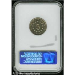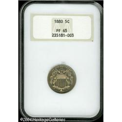 1880 5C PR65 NGC. Exquisitely struck, with touches <B>1880 5C PR65 NGC.</B></I> Exquisitely struck, with touches of light gold around the margins. The fields are nearly prooflike, and establish a nice contrast with the design elements. The only mentionable mark is a minute, unobtrusive abrasion on the top of the shield. <BR><BR><B>Important notice:</B> Heritage usually auctions material at the rate of 200-250 lots per hour. On some occasions eBay Live bid software or the Internet may not be able to keep up with the pace of the auction. We recommend placing a realistic absentee bid now as insurance to avoid disappointment. Occasionally the auctioneer may eliminate or reject an eBay Live bid, and the auctioneer may also reopen a lot after the close of the eBay live bidding (usually because we missed an audience bid), and may reject your bid even if it shows you as the winning bidder. By bidding via eBay Live, you agree that Heritage may award the lot to another bidder at its sole discretion under the circumstances described above or any other reasonable circumstances. Since eBay bids are not shown to us until we open the lot on the floor, we treat those bids just like floor bids. In most cases the floor responds before the eBay bid is presented to us, due to Internet lag time, so for consistency we have made it a policy that floor bids are always considered first over tie eBay live bids. Also please note that all Heritage lots purchased through eBay Live carry a 20% Buyer's Premium. Please make sure you read the Terms and Conditions before you bid. This lot is being auctioned in conjunction with a live floor auction by Heritage Galleries & Auctioneers. All final auction and invoice information will be supplied by Heritage Galleries & Auctioneers, and all other information should be considered preliminary. Lot:5513