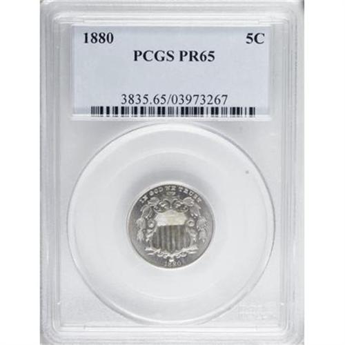 <B>1880 5C PR65 PCGS.</B></I> PCGS Population (293/136). NGC Census: (231/166). Mintage: 3,955. Numismedia Wsl. Price for NGC/PCGS coin in PR65: $620. (#3835)<BR><BR><B>Coin Engraver:</B> James B. Longacre<BR><BR><b>Shipping:</b> Coins & Currency (<a target="_blank" href="http://www.heritageauctions.com/common/shipping.php">view shipping information</a>\)