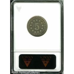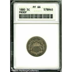 <B>1880 5C PR66 ANACS.</B></I> Speckled russet patina dances over bright surfaces. The obverse offers a cameo contrast when the coin is tilted under the light. Lot:5855