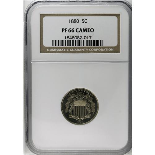 <B>1880<5C> PR66 Cameo NGC.</B></I> The frosted devices contrast sharply with the fields of champagne, gray, and blue. A pleasing Premium Gem.<BR><I>Ex: Fred S. Guggenheimer Collection (Stack's, 1/53), lot 194.</B></I><BR><I>From The Redfjord Collection.</B></I>