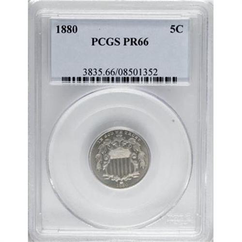 <B>1880 5C PR66 PCGS.</B></I> PCGS Population (120/15). NGC Census: (134/32). Mintage: 3,955. Numismedia Wsl. Price for NGC/PCGS coin in PR66: $900. (#3835)<BR><BR><B>Coin Engraver:</B> James B. Longacre<BR><BR><b>Shipping:</b> Coins & Currency (<a target="_blank" href="http://www.heritageauctions.com/common/shipping.php">view shipping information</a>\)