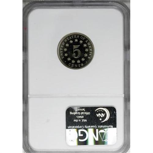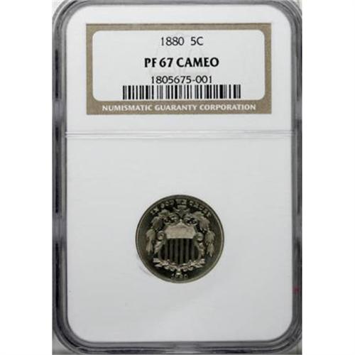 <B>1880 5C PR67 Cameo NGC.</B></I> Hints of golden toning visit the reflective fields, while the devices remain essentially untoned and show delicate, pleasing frost. Solid contrast and excellent eye appeal. NGC has certified just one finer Cameo coin (1/08).<BR><BR><b>Shipping:</b> Coins & Currency (<a target="_blank" href="http://www.heritageauctions.com/common/shipping.php">view shipping information</a>)