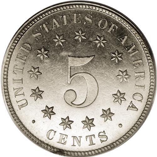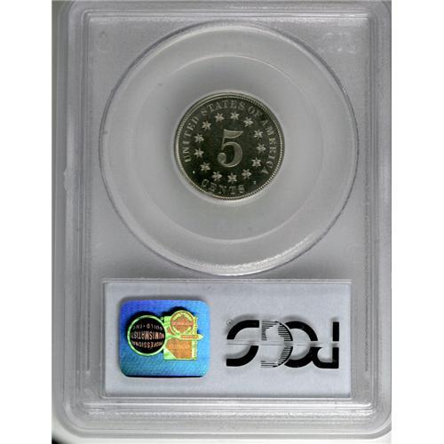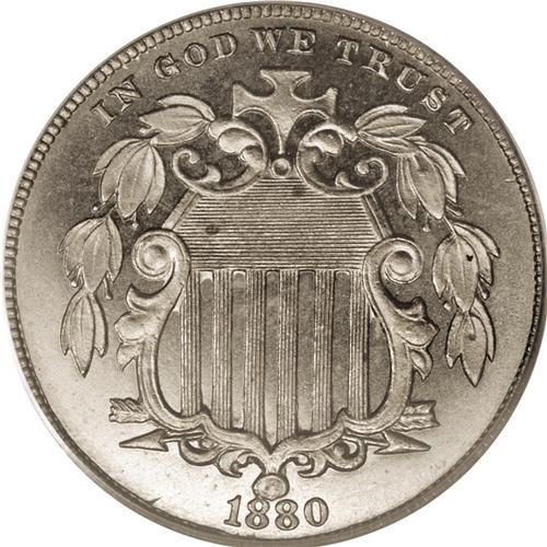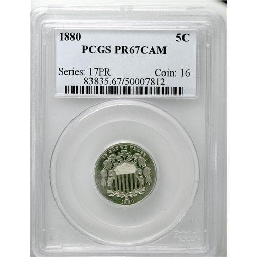 <B>1880<5C> PR67 Cameo PCGS.</B></I> An absolutely stunning type coin. The fields are deeply mirrored and the devices are noticeably frosted which gives the coin a strong cameo contrast. Brilliant and essentially perfect; the only "defect" we see is a tiny planchet flake adjacent to the obverse denticles at 7 o'clock. Population: 13 in 67 Cameo, 0 finer (7/06).<BR><I>From The Troy Wiseman Collection.</B></I>