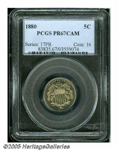 <B>1880<5C> PR67 Cameo PCGS.</B></I> Scattered with faint golden toning, this nicely reflective Shield Nickel shows deep mirrors and uncommonly frosted devices.<BR><I>From The Western Hills Collection.</B></I>