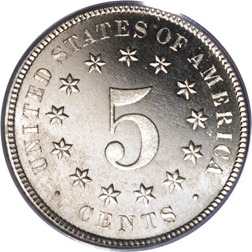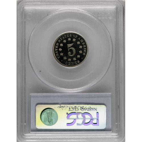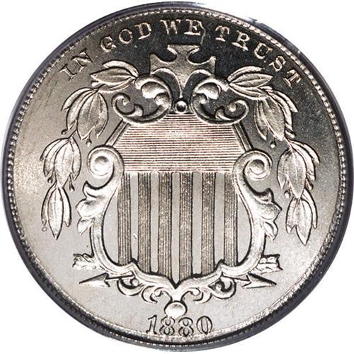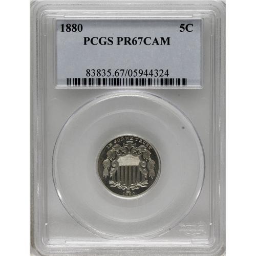 <B>1880 5C PR67 Cameo PCGS.</B></I> The steel-gray surfaces display a thin veil of ice-blue patina and a solitary, minuscule contact mark within the lower left vertical shield stripes. Sharply struck with pleasing contrast on both sides and delightful eye appeal. A great example of this later proof Shield nickel issue. Population: 13 in 67 Cameo, 0 finer (4/07).<BR><BR><b>Shipping:</b> Coins & Currency (<a target="_blank" href="http://www.heritageauctions.com/common/shipping.php">view shipping information</a>)