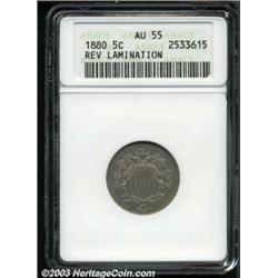 <TABLE cellSpacing=0 cellPadding=0 width="100%" bgColor=#000000 border=0><TBODY><TR><TD width="100%"><TABLE cellSpacing=1 cellPadding=3 width="100%" border=0><TBODY><TR><TD width="100%" bgColor=#79735c><FONT face=arial color=#ffffff size=3><B>Description</B> </FONT></TD></TR><TR><TD width="100%" bgColor=#ffffff><FONT face=arial size=2><B>1880 5C --Reverse Lamination--AU55 ANACS.</B></I> A small rectangular lamination (as made) is noted on the upper half of the prominent 5. The lowest mintage business strike Nickel, as only 16,000 pieces were struck. Although proofs are always available for a price, Choice AU commercial strikes are very rare. </FONT></TD></TR></TBODY></TABLE></TD></TR></TBODY></TABLE><BR><A name=PricesRealized></A><TABLE cellSpacing=0 cellPadding=0 width="100%" bgColor=#000000 border=0><TBODY><TR><TD width="100%"><TABLE cellSpacing=1 cellPadding=3 width="100%" border=0><TBODY><TR><TD width="100%" bgColor=#79735c><A name=PR><FONT face=arial color=#ffffff size=3><B>Previous Prices from Heritage Auctions</B> </FONT></A></TD></TR><TR><TD bgColor=#f6f6ed><TABLE cellSpacing=0 cellPadding=0 width="100%" border=1><TBODY><TR><TD align=middle width="33%"><B>Date</B></TD><TD align=middle width="33%"><B>Service</B></TD><TD align=middle width="33%"><B>Price</B></TD></TR><TR bgColor=whitesmoke><TD width="33%"><B>07/29/2002</B></TD><TD width="33%">ANACS</TD><TD width="33%">$2,301.15</TD></TR></TBODY></TABLE></TD></TR><TR><TD bgColor=#ffffff><FONT face=arial size=1 ?>PLEASE NOTE: All prices realized reflect the final hammer price PLUS the buyer's premium in auctions that charge a buyer's premium. Each item has a notation at the top of the listing indicating whether that lot included a buyer's premium. Example: A item that sells with a final hammer price of $100 and a 20% buyer's premium will display with a price realized of $120. All information listed is intended to be as accurate as possible, but errors are possible. Please use this guide carefully and inform us of any inaccuracies. </FONT></TD></TR></TBODY></TABLE></TD></TR></TBODY></TABLE><BR><TABLE cellSpacing=0 cellPadding=0 width="100%" bgColor=#000000 border=0><TBODY><TR><TD width="100%"><TABLE cellSpacing=1 cellPadding=3 width="100%" border=0><TBODY><TR><TD width="100%" bgColor=#79735c colSpan=6><FONT face=arial color=#ffffff size=3><B>Price Guide*</B> </FONT></TD></TR><TR bgColor=#f6f6ed><TD align=middle><B>Grade</B> </TD><TD align=middle><B>Coin World<BR>(Trends)</B> </TD><TD align=middle><B>Numismedia<BR>Retail</B> </TD><TD align=middle><B>Numismedia<BR>Wholesale</B> </TD><TD align=middle><B>Coin<BR>Universe</B> </TD><TD align=middle><B>Heritage<BR>Value Index</B> </TD></TR><TR bgColor=#ffffff><TD align=middle>53</TD><TD align=right>---</TD><TD align=right>$582.00</TD><TD align=right>$485.00</TD><TD align=right>---</TD><TD align=right>$769.89</TD></TR><TR style="FONT-WEIGHT: bold" bgColor=#cccfdd><TD align=middle>55</TD><TD align=right>---</TD><TD align=right>$750.00</TD><TD align=right>$625.00</TD><TD align=right>$1,000.00</TD><TD align=right>$805.00</TD></TR><TR bgColor=#ffffff><TD align=middle>58</TD><TD align=right>---</TD><TD align=right>$870.00</TD><TD align=right>$725.00</TD><TD align=right>---</TD><TD align=right>$888.00</TD></TR><TR bgColor=#ffffff><TD colSpan=6><FONT size=1>*All information listed is intended to be as accurate as possible, but errors are possible. No item may be returned or refused based on this information which is provided as a service to our customers. You should contact each pricing source directly to determine the accuracy of this information. </FONT></TD></TR></TBODY></TABLE></TD></TR></TBODY></TABLE><BR><TABLE cellSpacing=0 cellPadding=0 width="100%" bgColor=#000000 border=0><TBODY><TR><TD width="100%"><TABLE cellSpacing=1 cellPadding=3 width="100%" border=0><TBODY><TR><TD width="100%" bgColor=#79735c><FONT face=arial color=#ffffff size=3><B>Population Guide</B> </FONT></TD></TR><TR bgColor=#ffffff><TD align=middle><!-- Begin Output of Population Grid--><TABLE cellSpacing=0 cellPadding=0 width="100%" border=0><TBODY><TR><TD vAlign=center><TABLE cellSpacing=0 width="100%" border=1 cellsadding="3"><TBODY><TR><TD vAlign=center><TABLE cellSpacing=0 cellPadding=3 width="100%" border=1><TBODY><TR><TD vAlign=center align=middle bgColor=#f0f1e8 colSpan=2 <CENTER><FONT face=Arial size=2><B>PCGS Pop </B></FONT><CENTER></CENTER></TD><TD vAlign=center align=middle bgColor=#f0f1e8 colSpan=2><CENTER><FONT face=Arial size=2><B>NGC Pop</B></CENTER></FONT></TD></TR><TR><TD vAlign=center><FONT face=Arial size=2>(55)</FONT> </TD><TD vAlign=center align=right><FONT face=Arial size=2>5</FONT> </TD><TD vAlign=center><FONT face=Arial size=2>(55)</FONT> </TD><TD vAlign=center align=right><FONT face=Arial size=2>1</FONT> </TD></TR><TR><TD vAlign=center><FONT face=Arial size=2>(>55)</FONT> </TD><TD vAlign=center align=right><FONT face=Arial size=2>17</FONT> </TD><TD vAlign=center><FONT face=Arial size=2>(>55)</FONT> </TD><TD vAlign=center align=right><FONT face=Arial size=2>8</FONT> </TD></TR></TBODY></TABLE></TD></TR></TBODY></TABLE></TD></TR></TBODY></TABLE><!-- End Output of Population Grid--> Important notice: Heritage usually auctions material at the rate of 200-250 lots per hour. On some occasions eBay Live bid software or the Internet may not be able to keep up with the pace of the auction. We recommend placing a realistic absentee bid now as insurance to avoid disappointment. Occasionally the auctioneer may eliminate or reject an eBay Live bid, and the auctioneer may also reopen a lot after the close of the eBay live bidding (usually because we missed an audience bid), and may reject your bid even if it shows you as the winning bidder. By bidding via eBay Live, you agree that Heritage may award the lot to another bidder at its sole discretion under the circumstances described above or any other reasonable circumstances. Also please note that all Heritage lots purchased through eBay Live carry a 20% Buyer's Pre