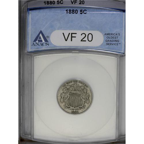 1880 5C VF20 ANACS. A moderately worn silver-gray exam