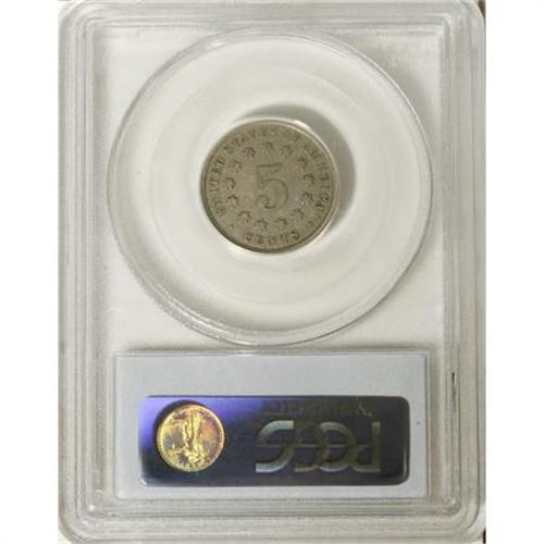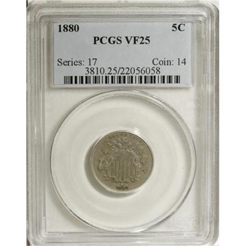 <B>1880 5C VF25 PCGS.</B></I> With only 16,000 business strikes coined, the 1880 has the lowest mintage for any issue intended for circulation. This moderately worn piece, turquoise-gray with hints of golden-tan at the margins, offers smooth surfaces with only a few marks.<BR><BR><B>Coin Engraver:</B> James B. Longacre<BR><BR><b>Shipping:</b> Coins & Currency (<a target="_blank" href="http://www.heritageauctions.com/common/shipping.php">view shipping information</a>)