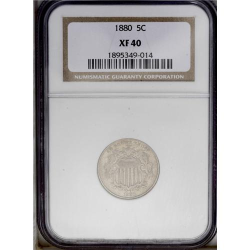 <B>1880<5C> XF40 NGC.</B></I> An elusive business strike Shield nickel that is perhaps even more challenging than its tiny mintage of 16,000 pieces would suggest. Both sides display balanced wear and exhibit a pleasing natural gray appearance.