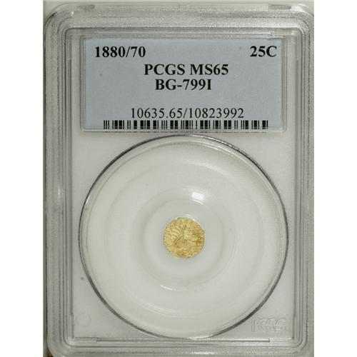 <B>1880/70 25C Indian Octagonal 25 Cents, BG-799I, R.6, MS65 PCGS.</B></I> A gleaming Gem piece that has practically black-and-gold contrast on the obverse. Minimally marked and highly appealing. Population: 2 in 65, 0 finer (1/07).<BR><BR><b>Shipping:</b> Coins & Currency (<a target="_blank" href="http://www.heritageauctions.com/common/shipping.php">view shipping information</a>)