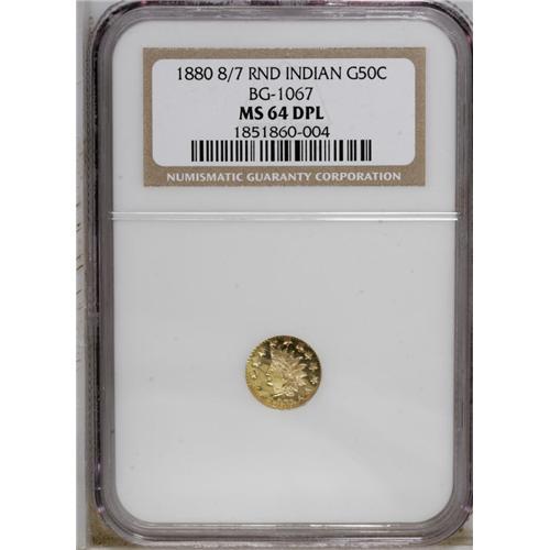 <B>1880/70<50C> Indian Round 50 Cents, BG-1067, Low R.4, MS64 Deep Prooflike NGC.</B></I> One of just two examples certified as Deep Prooflike, this piece earns that designation with immense reflectivity and surprising contrast. The yellow-gold fields host lightly frosted devices.