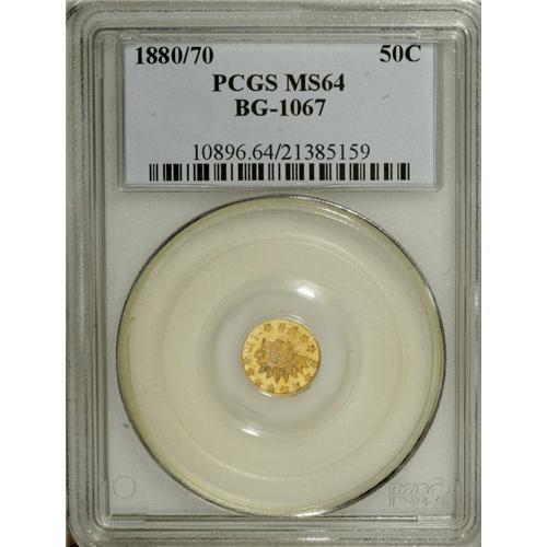 <B>1880/70 50C Indian Round 50 Cents, BG-1067, Low R.4, MS64 PCGS.</B></I> A visually impressive, prooflike example with planchet flaking on the right side of the reverse as often seen. The corner of the previous 7 is visible at the upper right curve of the second 8, the only identifying feature of this overdate.<BR><BR><b>Shipping:</b> Coins & Currency (<a target="_blank" href="http://www.heritageauctions.com/common/shipping.php">view shipping information</a>)