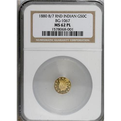 <B>1880/70 50C Indian Round 50 Cents, BG-1067, Low R.4, MS62 Prooflike NGC.</B></I> Well struck on a slightly wavy planchet, with watery fields and pleasing light-green coloration. Wispy field marks limit the grade. Census: 3 in 62 Prooflike, 2 finer (9/07). <BR><BR><b>Shipping:</b> Coins & Currency (<a target="_blank" href="http://www.heritageauctions.com/common/shipping.php">view shipping information</a>)