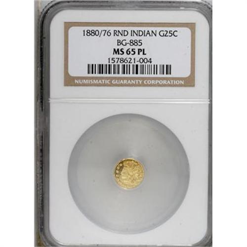 <B>1880/76 25C Indian Round 25 Cents, BG-885, R.3, MS65 Prooflike NGC.</B></I> This overdate variety is the only recognized round quarter dollar issue of 1880. This piece is remarkably well struck, with clockwise die rotation noted of approximately one hundred fifty degrees. Minimal post-striking damage is evident on either side. <BR><BR><b>Shipping:</b> Coins & Currency (<a target="_blank" href="http://www.heritageauctions.com/common/shipping.php">view shipping information</a>)