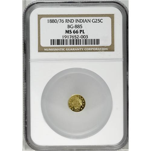 <B>1880/76<25C> Indian Round 25 Cents, BG-885, R.3, MS66 Prooflike NGC.</B></I> A flashy and attractive white-gold Premium Gem that appears the same today as when it was first made. Essentially perfect save for an occasional incompleteness of strike.
