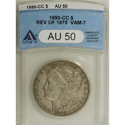 <B>1880/79-CC $1 Reverse of 1878 AU50 ANACS.</B></I> VAM-7. NGC Census: (0/1019). PCGS Population (0/2387). Mintage: 591,000. Numismedia Wsl. Price for NGC/PCGS coin in AU50: $250. (#7108)<BR><BR><B>Coin Engraver:</B> George T. Morgan<BR><BR><b>Shipping:</b> Coins & Currency (<a target="_blank" href="http://www.heritageauctions.com/common/shipping.php">view shipping information</a>)