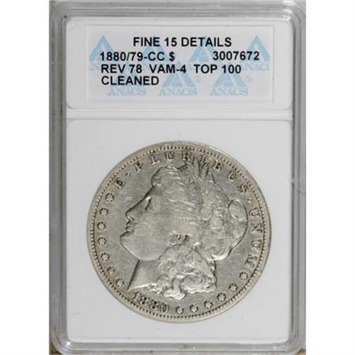 <B>1880/79-CC $1 Reverse of 1878--Cleaned--ANACS. Fine 15 Details. </B></I>VAM-4 Top 100. NGC Census: (0/1023). PCGS Population (2/2382). Mintage: 591,000. Numismedia Wsl. Price for NGC/PCGS coin in F15: $167. (#7108)<BR><BR><B>Coin Engraver:</B> George T. Morgan<BR><BR><b>Shipping:</b> Coins & Currency (<a target="_blank" href="http://www.heritageauctions.com/common/shipping.php">view shipping information</a>)