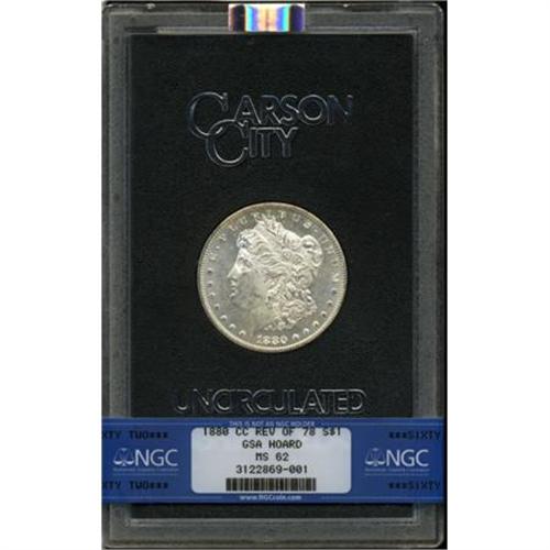 <B>1880/79-CC $1 Reverse of 1878 MS62 NGC.</B></I> VAM-4. A Top 100 Variety. This mildly prooflike Carson City dollar is sharply struck and nearly untoned. The reverse is well preserved, while the left obverse displays distributed small marks. The box and certificates of GSA issue accompany the lot.<BR><BR><B>Coin Engraver:</B> George T. Morgan<BR><BR><b>Shipping:</b> Coins & Currency (<a target="_blank" href="http://www.heritageauctions.com/common/shipping.php">view shipping information</a>)