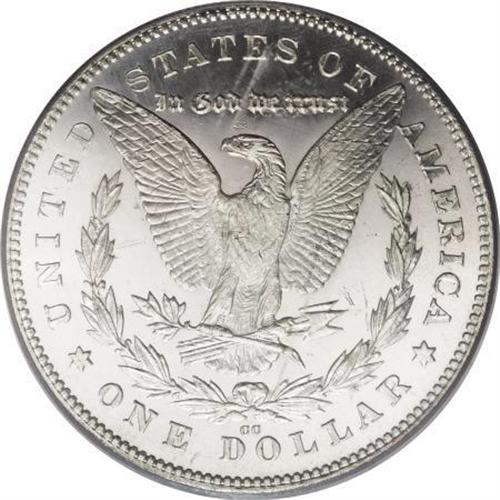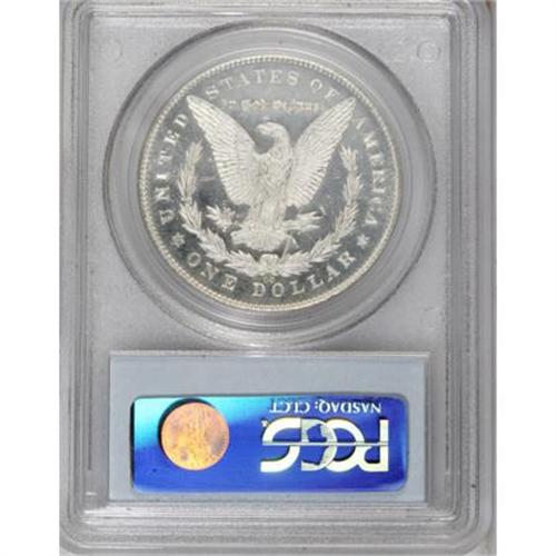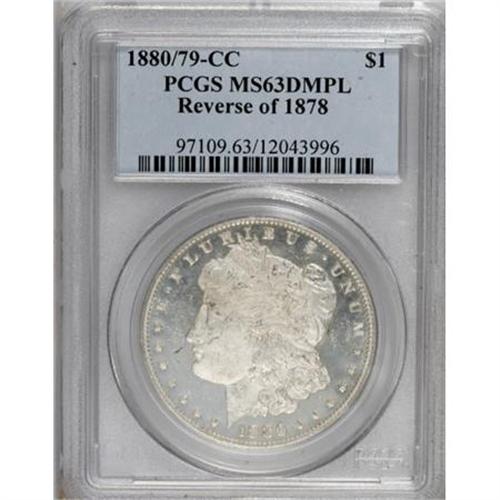 <B>1880/79-CC $1 Reverse of 1878 MS63 Deep Mirror Prooflike PCGS.</B></I> VAM-4. A Top 100 Variety. Underdigits are prominent below the second 8 and 0 in the date, and that obverse is paired with the Reverse of 1878. A decisively struck, faintly gold-toned Select piece with spectacular reflectivity despite a measure of haze over the fields. The richly frosted devices show a number of scattered abrasions that account for the grade. Population: 10 in 63 Deep Mirror Prooflike, 15 finer (10/07).<BR><BR><b>Shipping:</b> Coins & Currency (<a target="_blank" href="http://www.heritageauctions.com/common/shipping.php">view shipping information</a>)