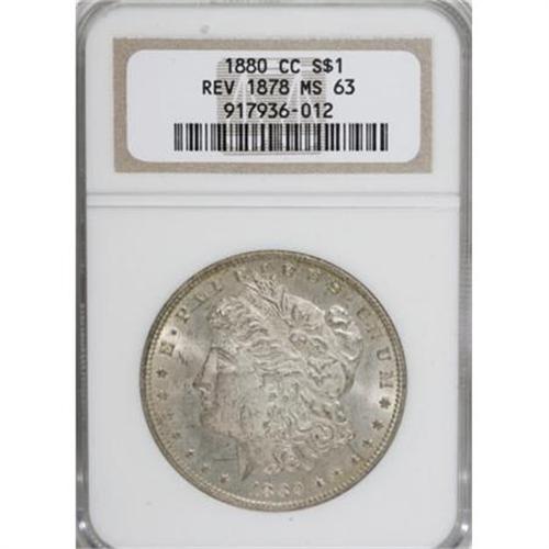 <B>1880/79-CC $1 Reverse of 1878 MS63 NGC.</B></I> VAM-4. A Top 100 Variety. The overdate and VAM are undesignated on the NGC holder. Original caramel-gold and cream-gray coloration are blended throughout this satiny and crisply struck CC-mint dollar. The reverse is well preserved, and the obverse has only faint facial marks.<BR><BR><B>Coin Engraver:</B> George T. Morgan<BR><BR><b>Shipping:</b> Coins & Currency (<a target="_blank" href="http://www.heritageauctions.com/common/shipping.php">view shipping information</a>)