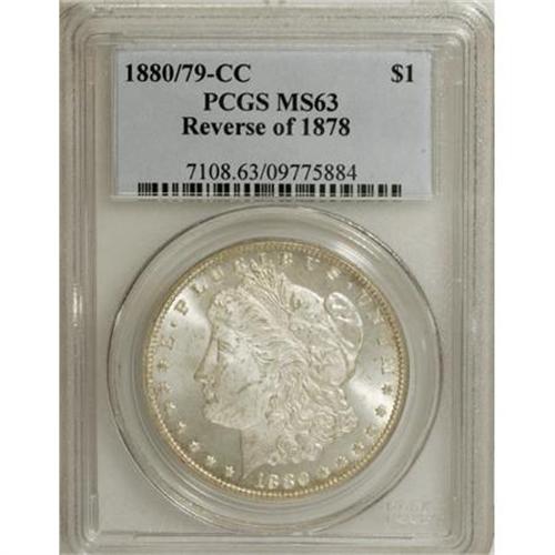 <B>1880/79-CC $1 Reverse of 1878 MS63 PCGS.</B></I> PCGS Population (648/1416). NGC Census: (309/580). Mintage: 591,000. Numismedia Wsl. Price for NGC/PCGS coin in MS63: $520. (#7108)<BR><BR><B>Coin Engraver:</B> George T. Morgan<BR><BR><b>Shipping:</b> Coins & Currency (<a target="_blank" href="http://www.heritageauctions.com/common/shipping.php">view shipping information</a>)