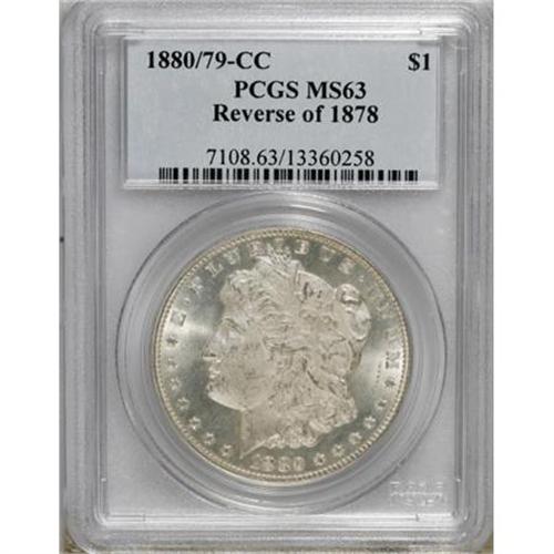 <B>1880/79-CC $1 Reverse of 1878 MS63 PCGS.</B></I> . PCGS Population (664/1491). NGC Census: (327/595). Mintage: 591,000. Numismedia Wsl. Price for NGC/PCGS coin in MS63: $525. (#7108)<BR><BR><B>Coin Engraver:</B> George T. Morgan<BR><BR><b>Shipping:</b> Coins & Currency (<a target="_blank" href="http://www.heritageauctions.com/common/shipping.php">view shipping information</a>)